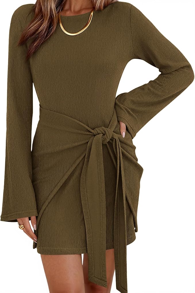 - The Party Dress Features Dramatic Bell Sleeves, Flattering Boat Neckline That Create An Elegant Look. Waist Tie Detail Allows You To Create Beautiful Gathering Effects While Accentuating Your Curves. Cute Dresses Style In Slim-Fit Showcase Your Silhouette While The Stretchy Ribbed Knit Fabric Ensures Comfortable Movement Throughout All Day