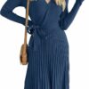 - Elegant fall dress, features v neck, wrap style, long sleeve, ribbed knit, solid color, ruffle pleated skirt, removable belt, nice midi length can better show off your calf curves