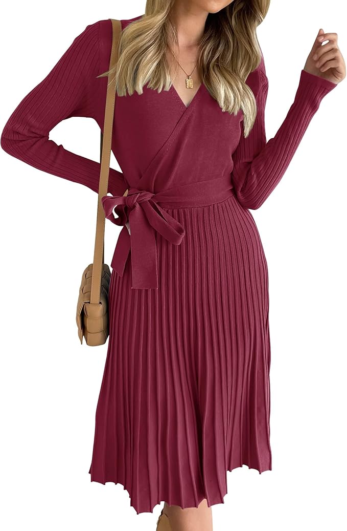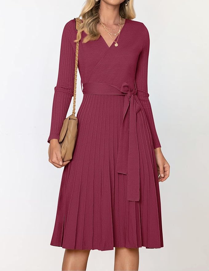 - Elegant fall dress, features v neck, wrap style, long sleeve, ribbed knit, solid color, ruffle pleated skirt, removable belt, nice midi length can better show off your calf curves