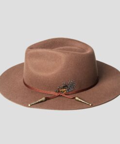 This striking, stylish fedora is made of 100% firm wool felt. It features a 4 1/2″ teardrop crown and a 3″ bound-edge flat brim. Additional details include a braided hat band and a feather detail.