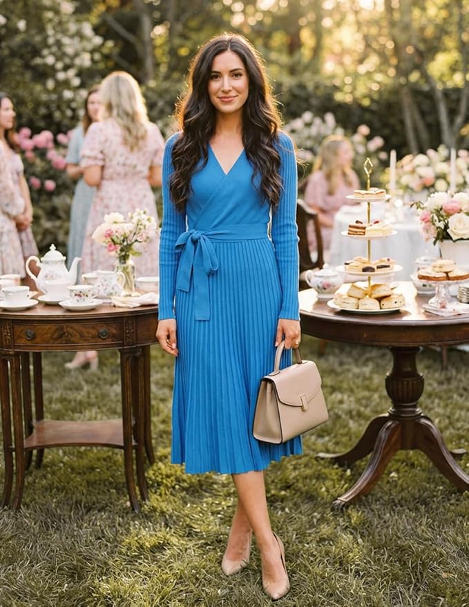 - Wrap v neck adds some sexy and mature vibes, high waist belted design can flatters your waistline, the pleated a line skirt makes you like a girl. Great for casual, daily, vacation, holiday, office, dating, anniversary, ceremony, party, cocktail, wedding, etc