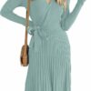 - Elegant fall dress, features v neck, wrap style, long sleeve, ribbed knit, solid color, ruffle pleated skirt, removable belt, nice midi length can better show off your calf curves