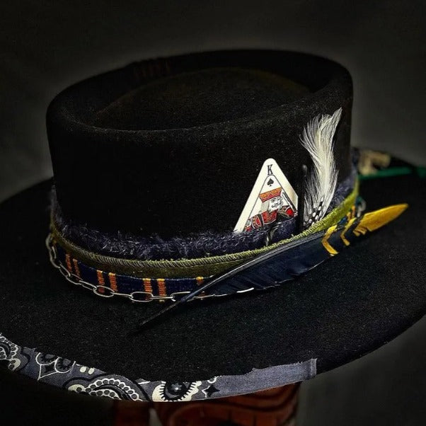All vintage-style hats are hand-distressed, hand-dyed, and hand-torched, ensuring no two share the same color or design. Each piece is uniquely imperfect, with subtle variations from product images.
