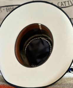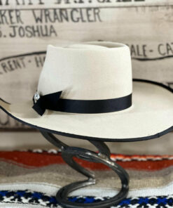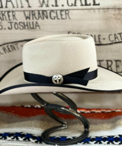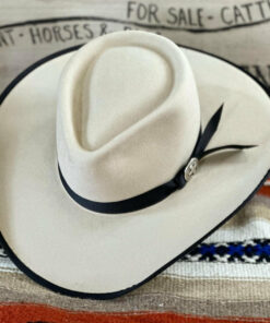 This hat’s light belly hue and warm tan tones pair beautifully with its black trim, creating a striking, timeless look. The pinched front crown measures 4.5″ at the back and slopes slightly to 4″ in the front, offering a balanced silhouette. Its 4″ brim features a soft roll on the sides with a black bound edge for a touch of contrast. A 7/8″ grosgrain ribbon hatband, accented with a vintage-style Cross concho, completes the design. Distinctive and full of character, this hat stands out for its unique blend of color, band, and classic Western style.