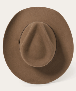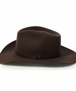 Handcrafted from high quality wool felt for a sturdy finish and unique style. It has a 4 1/4-inch pinch crown, 3 1/4-inch brim, and a three-cord braided leather hatband with buffalo nickel pins.