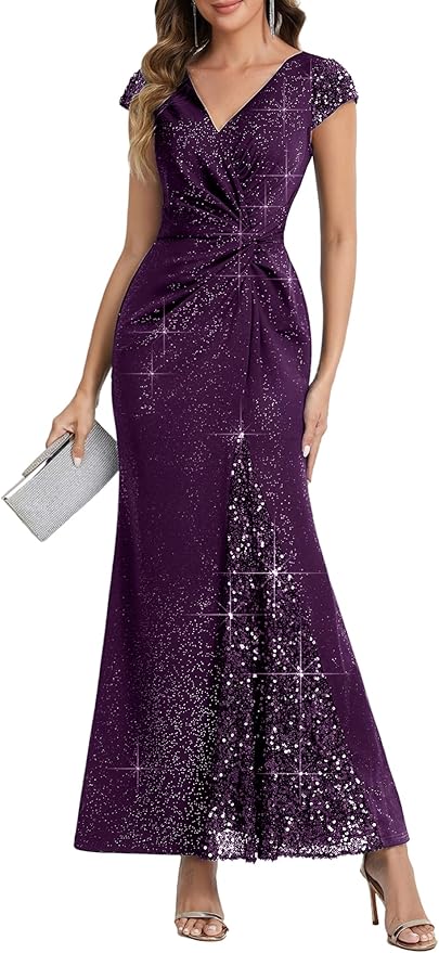 - Features: Twist-front design, floor length, cap sleeve, V-neck, bodycon silhouette, contrast sequin patchwork panel, high stretch fabric, elegant sequin detailing, fully lined, no padding, concealed back zipper